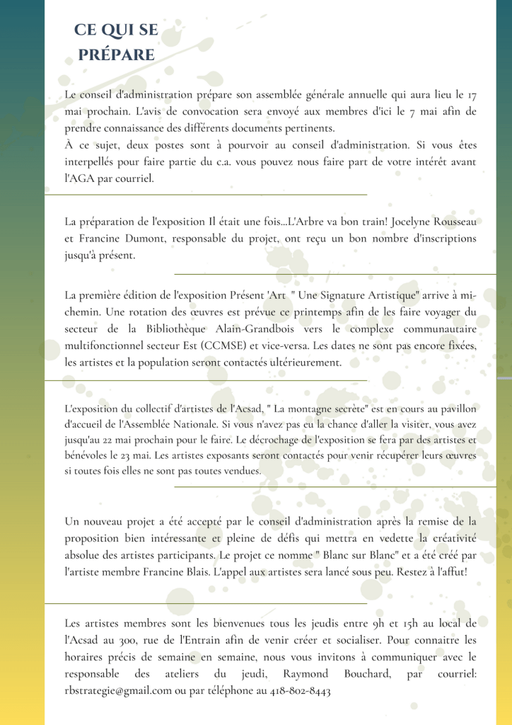 La Gazette ACSAD printemps 2023 Voici la dernière parution de la Gazette ACSAD. Bonne lecture! wp-1683029639310Télécharger Partager : Partager sur X(ouvre dans une nouvelle fenêtre) X Partager sur Facebook(ouvre dans une nouvelle fenêtre) Facebook J’aime chargement… Similaire Laisser un commentaire Annuler la réponse. Δ