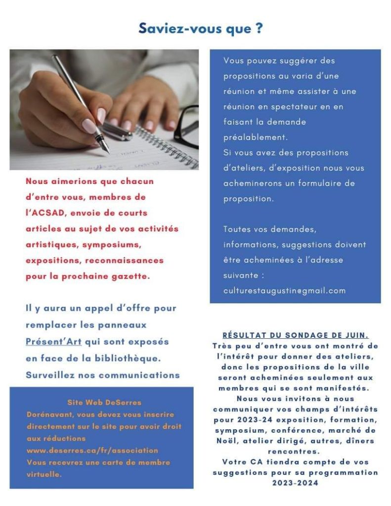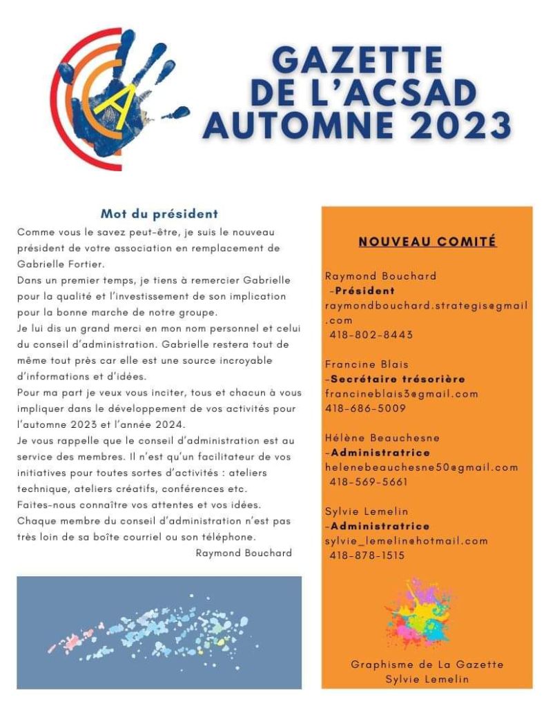 La Gazette Acsad- automne 2023 Gazette Automne 2023 PDFTélécharger Partager : Partager sur X(ouvre dans une nouvelle fenêtre) X Partager sur Facebook(ouvre dans une nouvelle fenêtre) Facebook J’aime chargement… Similaire Laisser un commentaire Annuler la réponse. Δ